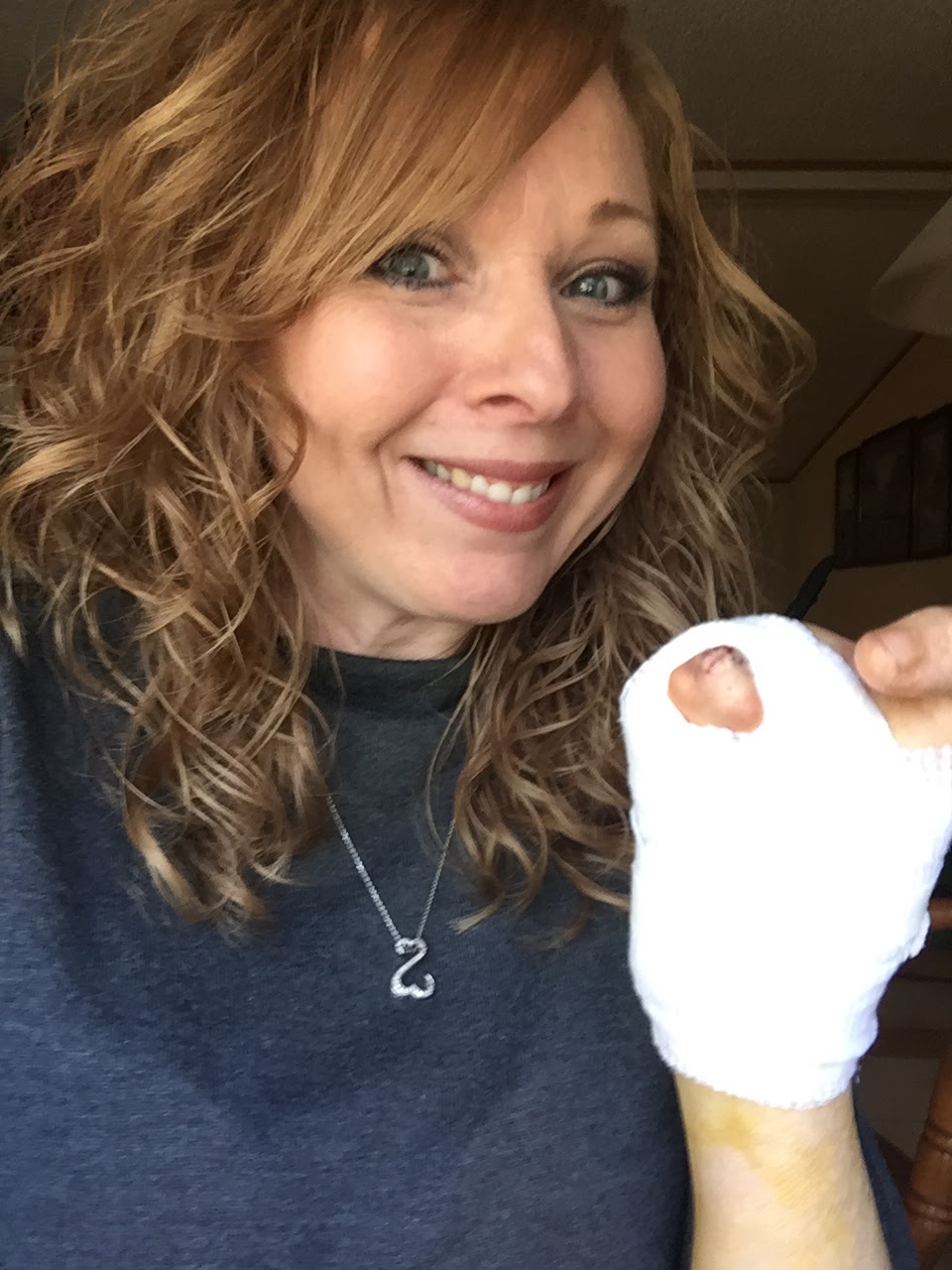 My doctor was very upset when he realized that I had to go through the recovery without pain medication, but with my history of allergies, we decided not to try any different medicine. And now the therapy of learning to use my hand again without anything for pain. It’s so very sore. While the overall swelling is good, it is still uncomfortable. I can’t really explain the feeling. It’s definitely odd. My thumb almost feels heavy—kind of foreign to me. I can move it inward to squeeze a little, but right now I can’t move it outward at all. My doctor was not concerned. He thinks I am tough and will be able to figure it out in no time. He did wrap it again. Where the skin graft was placed it is still bloody. It will take a while for it to heal. I have to wear the new bandage until Friday. And I have to keep gauze pads between my thumb and hand for a while because it wants to move back into the original position.